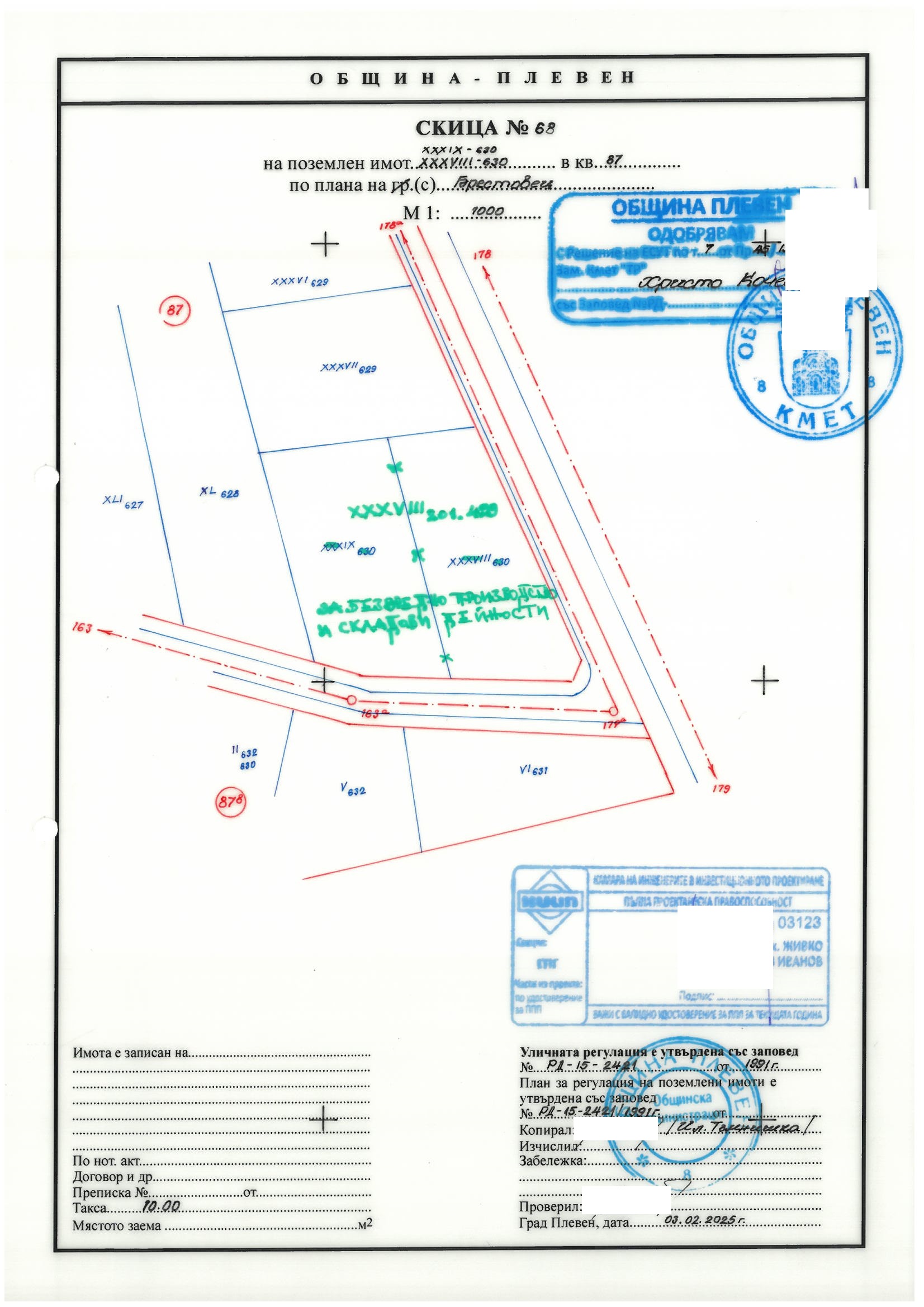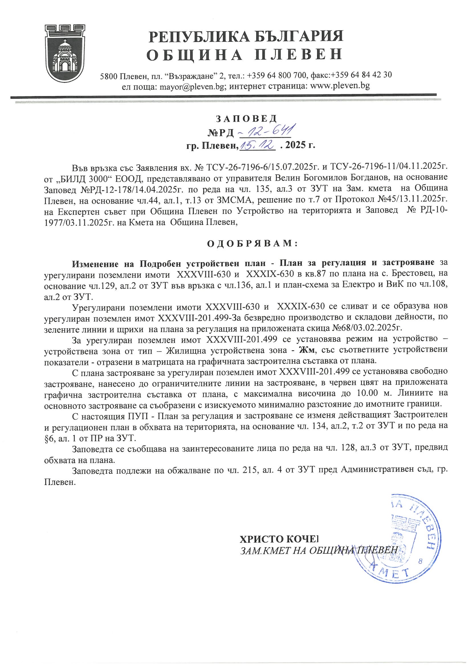 Община Плевен, на основание чл.129, ал.2 от Закона за устройство на територията съобщава, че със заповед № РД-12-641/15.12.2025 г. на Зам. кмет на Община Плевен е одобрен проект за изменение на: