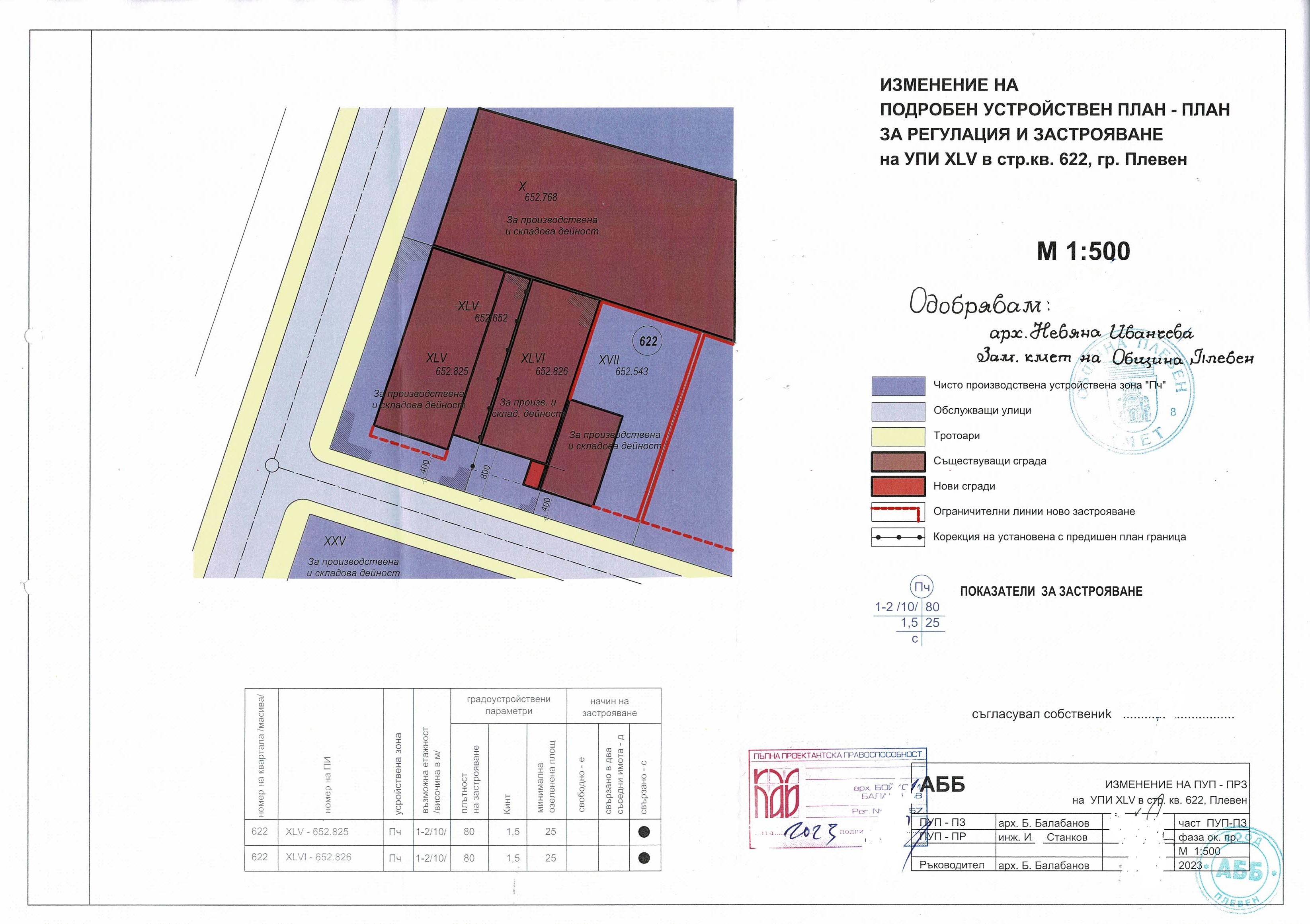 Изменение на Подробен Устройствен План - План за Регулация и Застрояване за УПИ XLV- за производствена и складова дейност и трафопост, кв.622 по плана на гр. Плевен