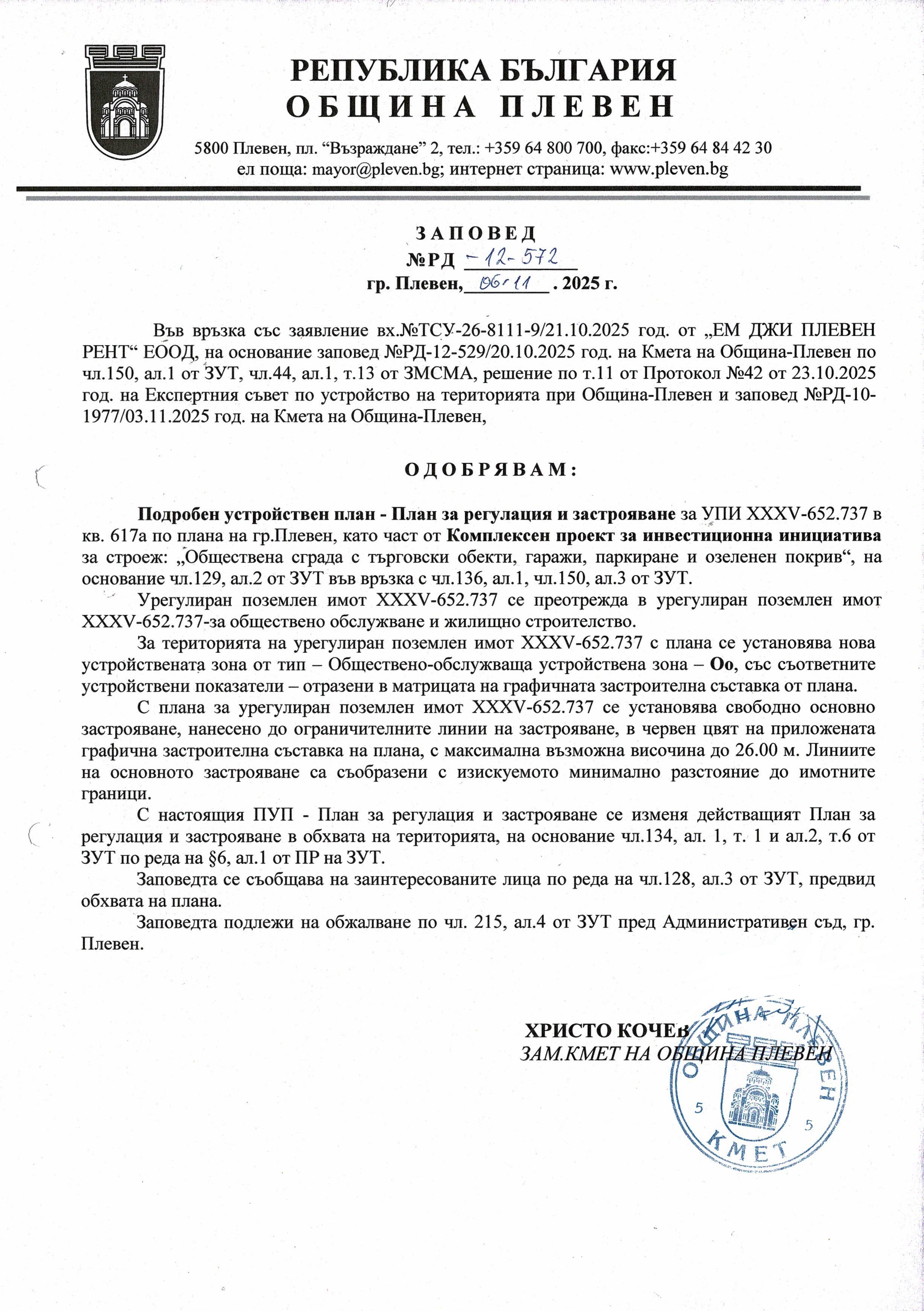 Община Плевен, на основание чл.129, ал.2 от Закона за устройство на територията съобщава, че със заповед № РД-12- 572/06.11.2025г. е одобрен: