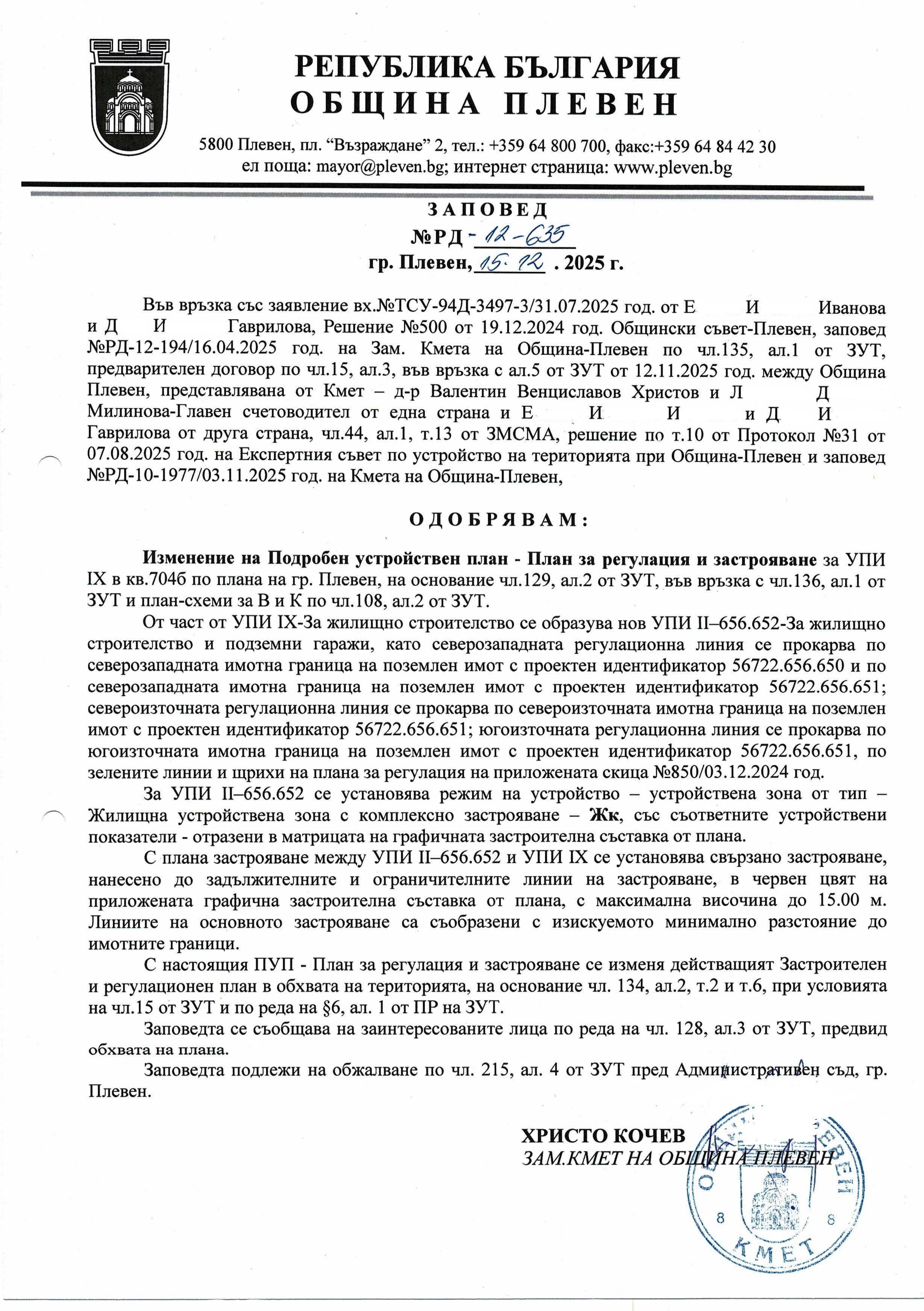 Община Плевен, на основание чл.129, ал.2 от Закона за устройство на територията съобщава, че със заповед № РД-12-635/15.12.2025 г. на Кмета на Община Плевен е одобрен: