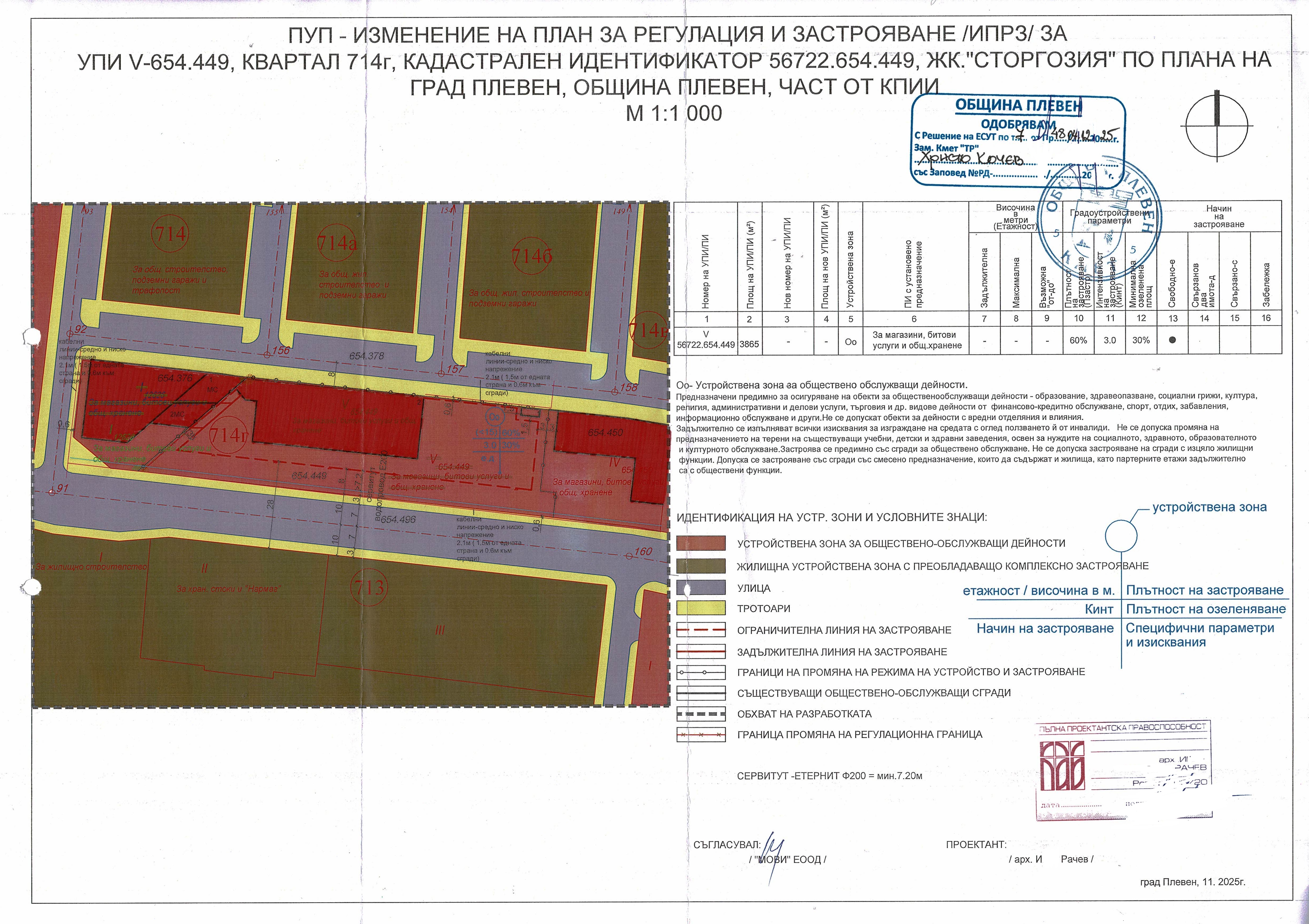 Подробен устройствен план- План за регулация и застрояване за УПИ V-654.449 За магазини, битови услуги и обществено хранене и I-12626 – За магазини, битови услуги и обществено хранене, кв.714 г и улица по ок 92- ок 156 – ок 157 към ок 158 по плана на гр. Плевен, като част от Комплексен проект за инвестиционна инициатива -проекти и Разрешение за строеж №456/15.12.2025г. за обект: „АПТЕКА ЗА ЛЕКАРСТВЕНИ ПРОДУКТИ, с изключение на приготвяни по магистрална и фармакопейна рецептура”