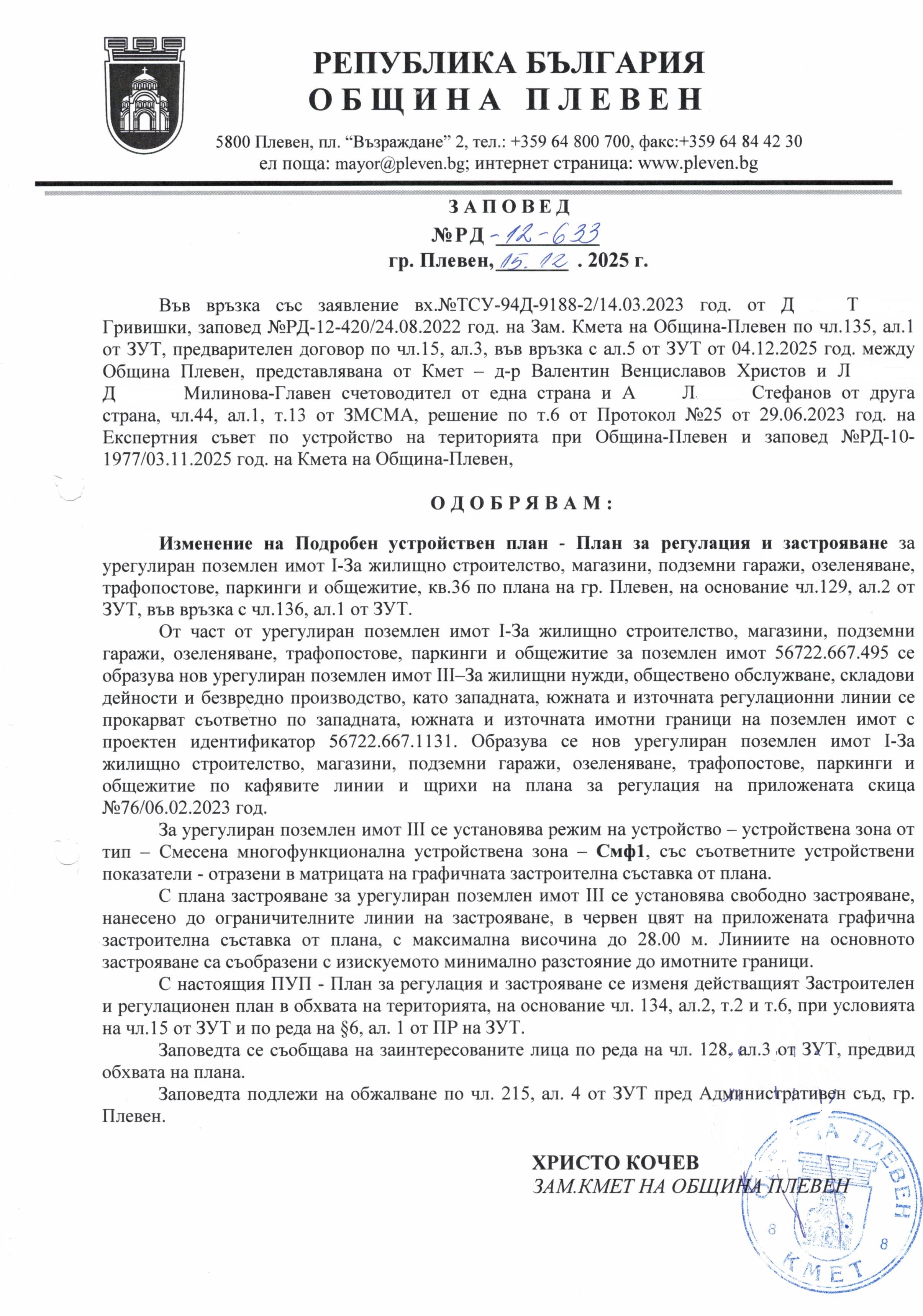 Община Плевен, на основание чл. 129, ал.2 от Закона за устройство на територията съобщава, че със заповед № РД-12-633/15.12.2025г. е одобрен