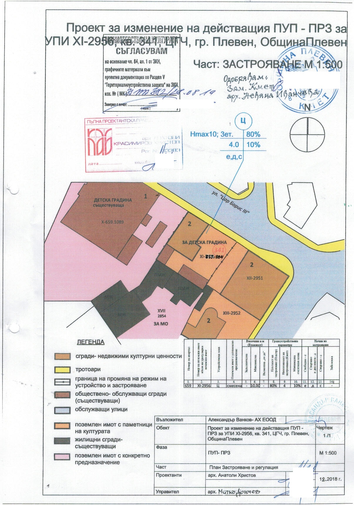 Изменение на План за регулация и застрояване като част от КПИИ за урегулиан поземлен имот ХІ-2956, кв.341, одобрени проекти и Разрешение за строеж №52/ 04.03.2020г. за обект: „Преустройство на съществуваща жилищна сграда в Детска градина”,