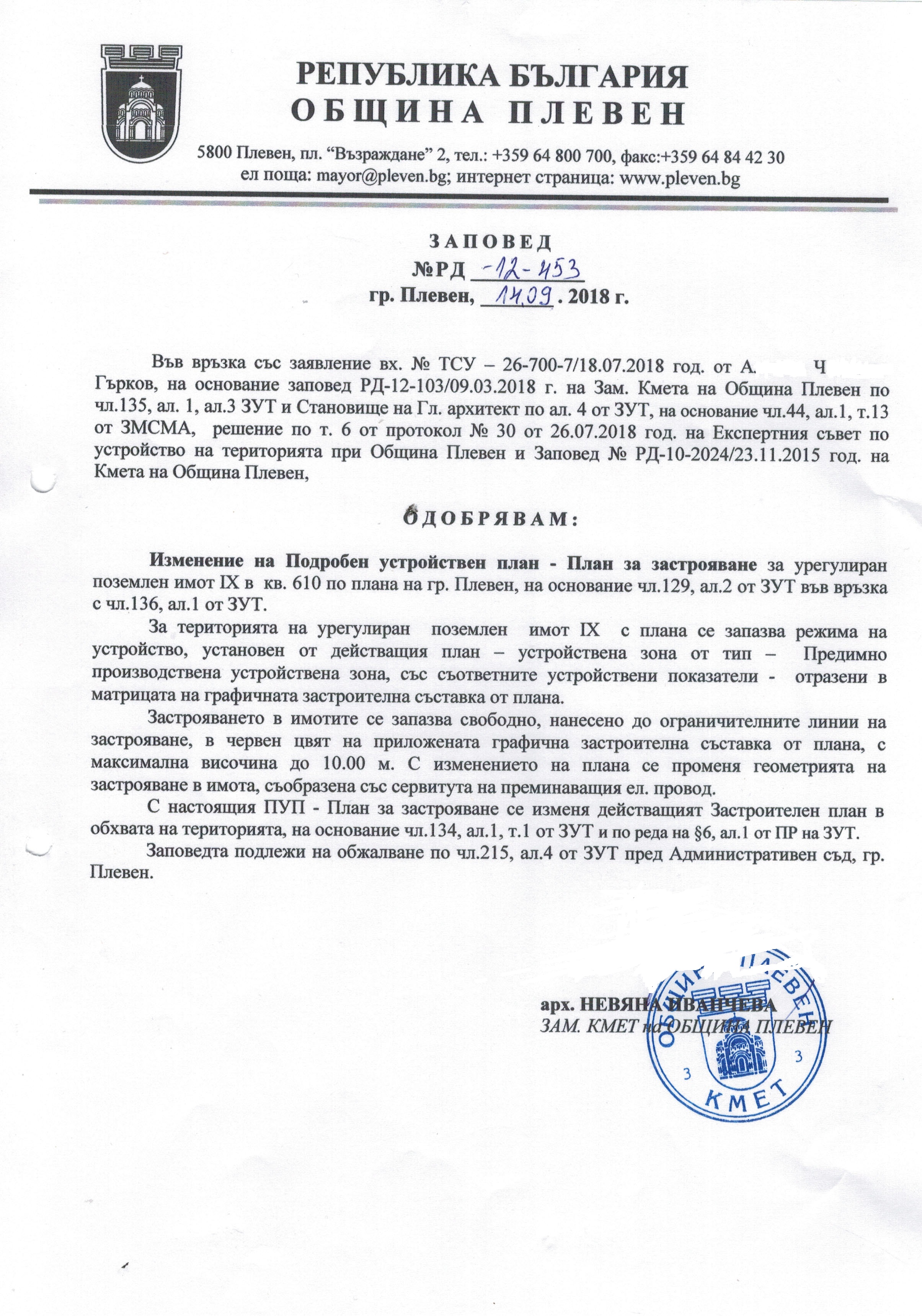 Община Плевен, на основание чл.129, ал.2 от Закона за устройство на територията съобщава, че със заповед № РД-12-453/ 14.09.2018г. на Зам. Кмета на Община Плевен е одобрен