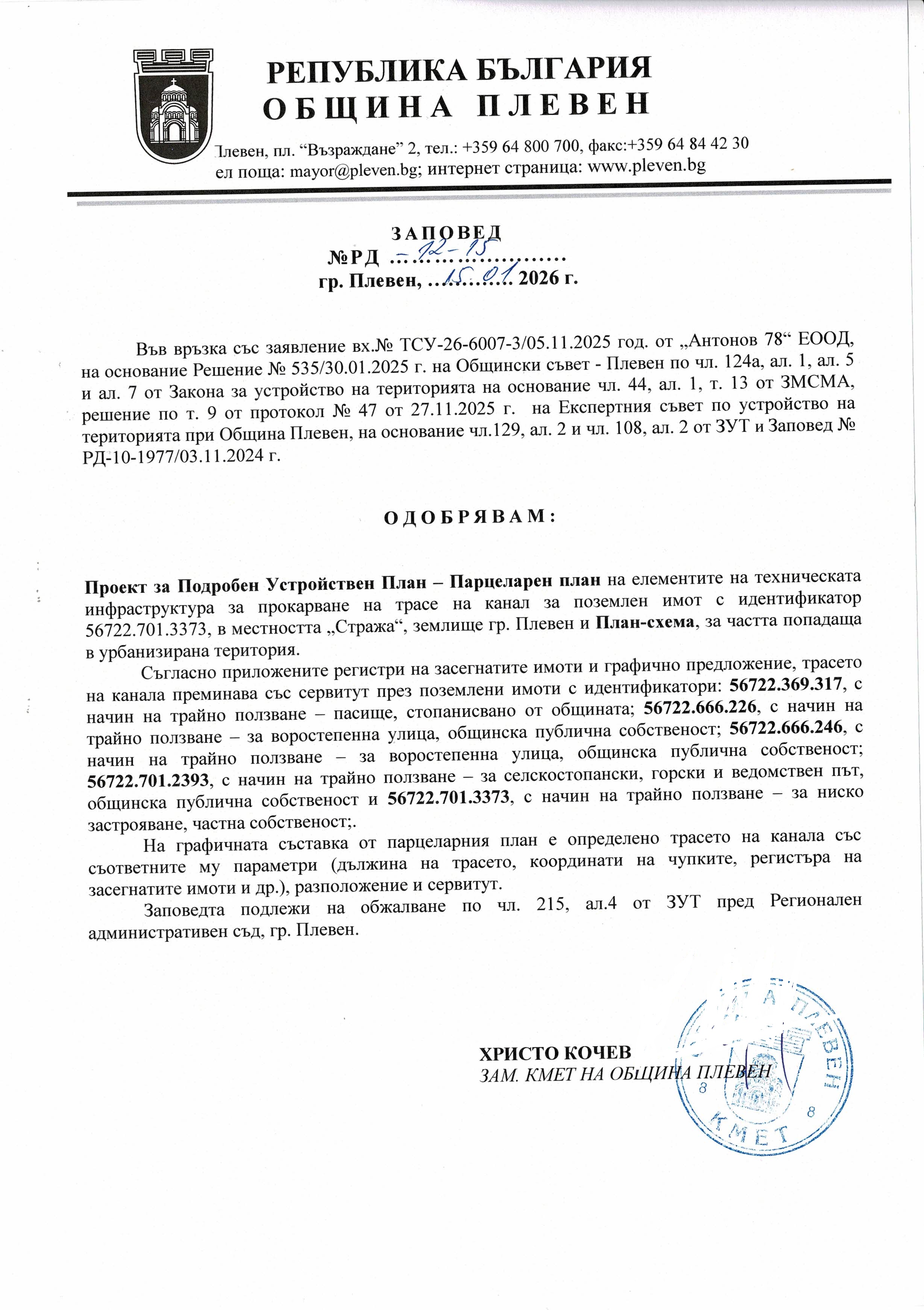 Община Плевен, на основание чл.129, ал.2 от Закона за устройство на територията, съобщава, че със Заповед №РД - 12 – 15 от 15.01.2026год. на Зам. Кмета на Община Плевен е одобрен: