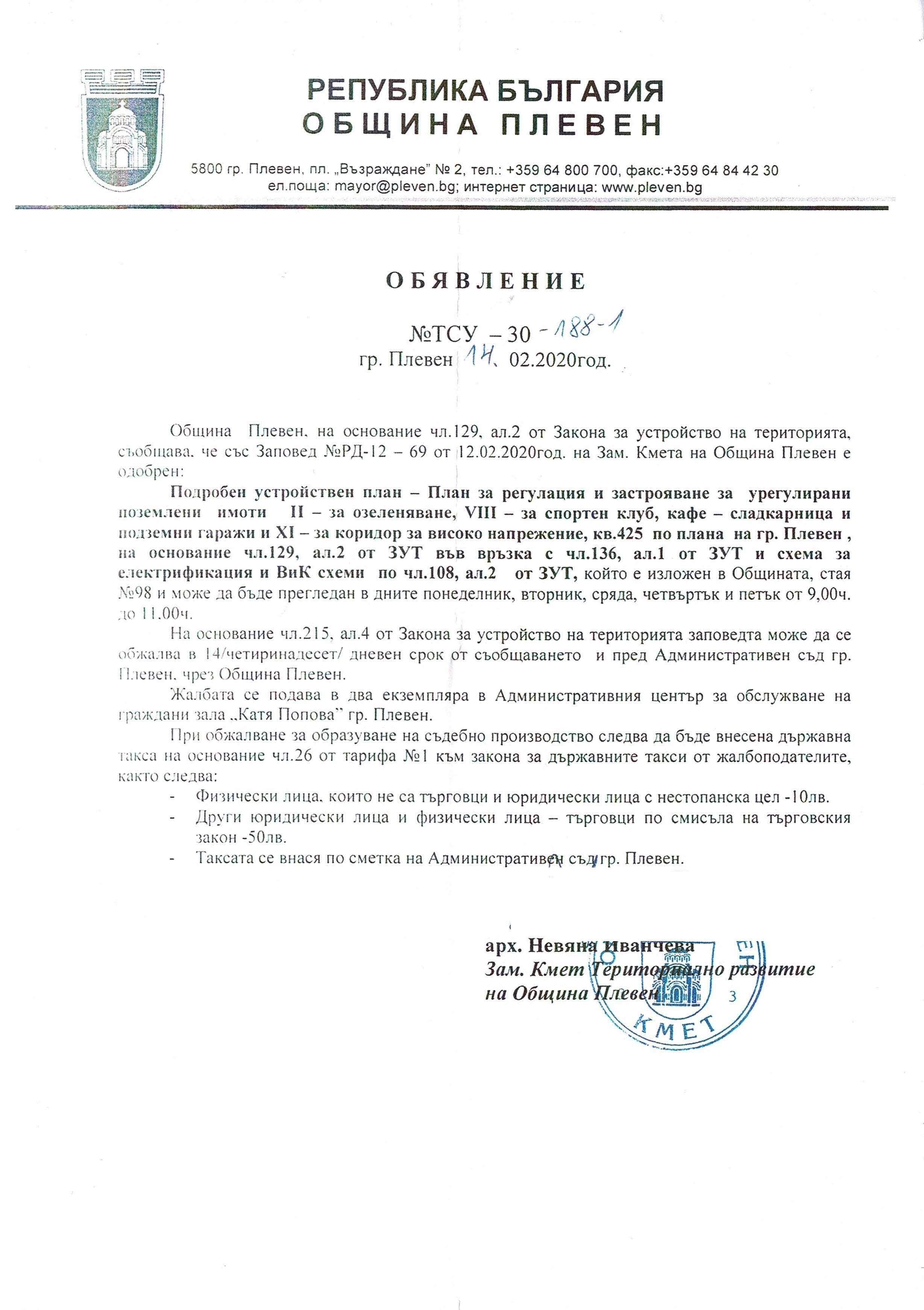 ОБЯВЛЕНИЕ № ТСУ-30-188-1/14.02.2020г.гр.Плевен понеделник, 24 февруари 2020 1567 Файлове: CCI_000250 (1).jpg CCI_000251.jpg CCI_000253.jpg CCI_000252.jpg
