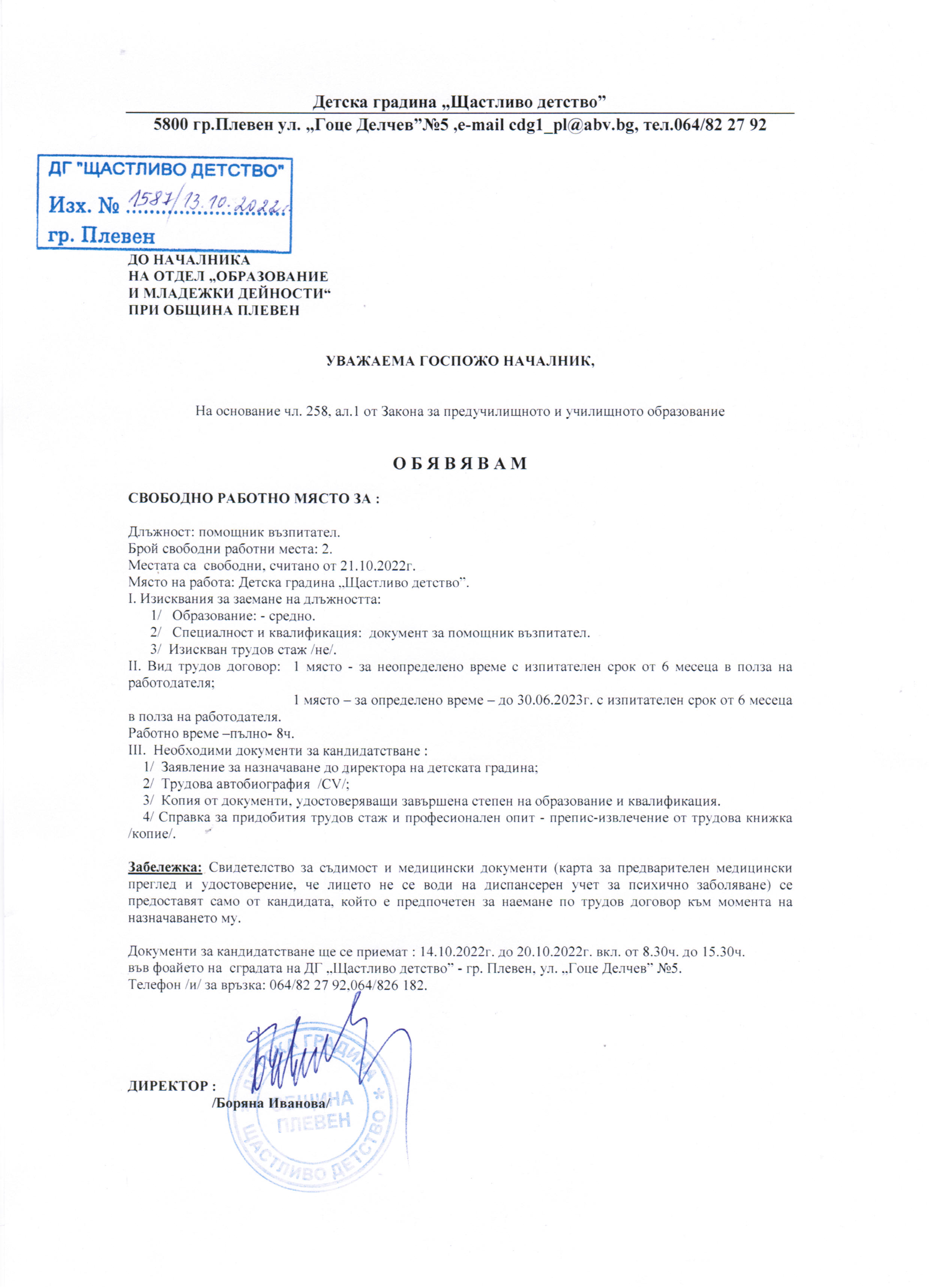 Свободно работно място - помощник възпитател , ДГ"Щастливо детство", Плевен вторник, 18 октомври 2022 1804 Файлове: ДГ Щастливо детство.jpg